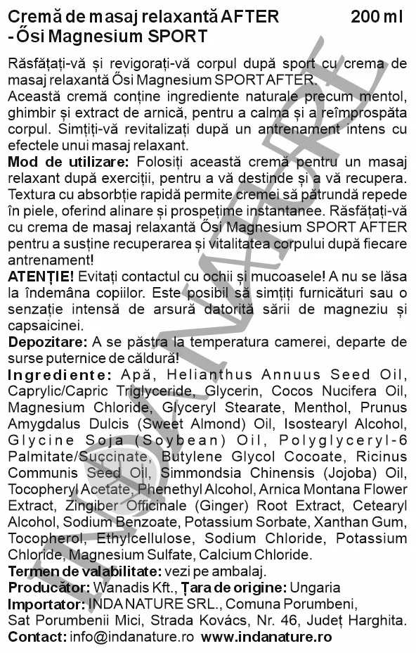 Ősi Magnesium SPORT AFTER este o cremă de masaj relaxantă, special concepută pentru regenerarea musculară după antrenamente intense. Formula sa eficientă combină conținutul ridicat de magneziu cu extracte naturale atent selecționate, oferind o senzație rapidă de relaxare, prospețime și confort muscular.