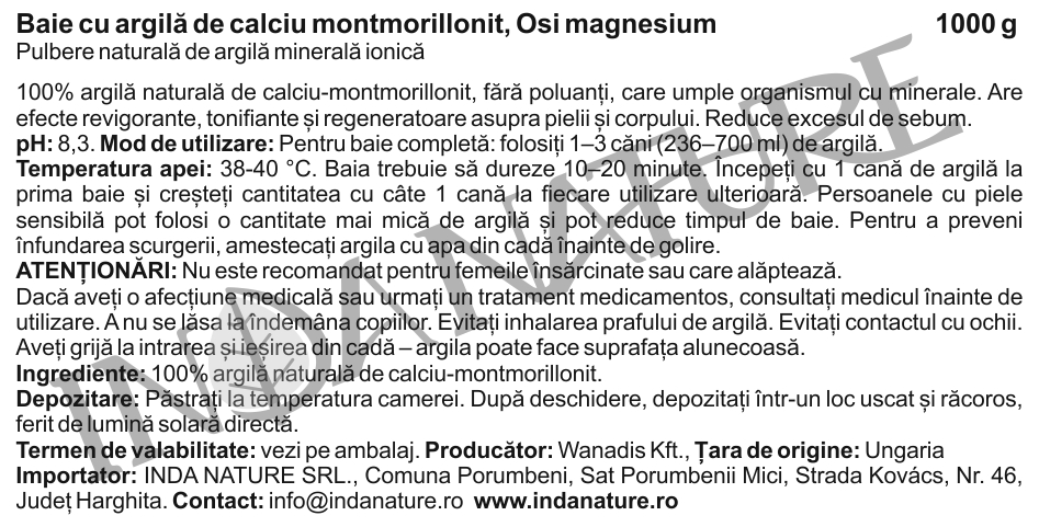 Figyelmeztetések:Nem ajánlott várandós vagy szoptató nők számára.Ha valamilyen egészségügyi problémája van, vagy gyógyszeres kezelés alatt áll, használat előtt konzultáljon orvosával.Gyermekektől elzárva tartandó.Kerülje az agyagpor belélegzését.Kerülje a szemmel való érintkezést.Legyen óvatos a kádba való be- és kilépéskor – az agyag csúszóssá teheti a felületet.